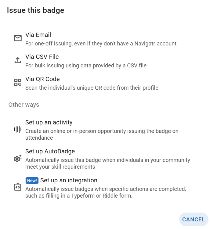 Issuing badges via QR Code is an efficient way to award badges using a user’s unique QR code, without needing to share their email address. Badges issued through this method are claimed immediately and automatically added to the user's badge profile. It’s ideal for in-person events, workshops, or training sessions.