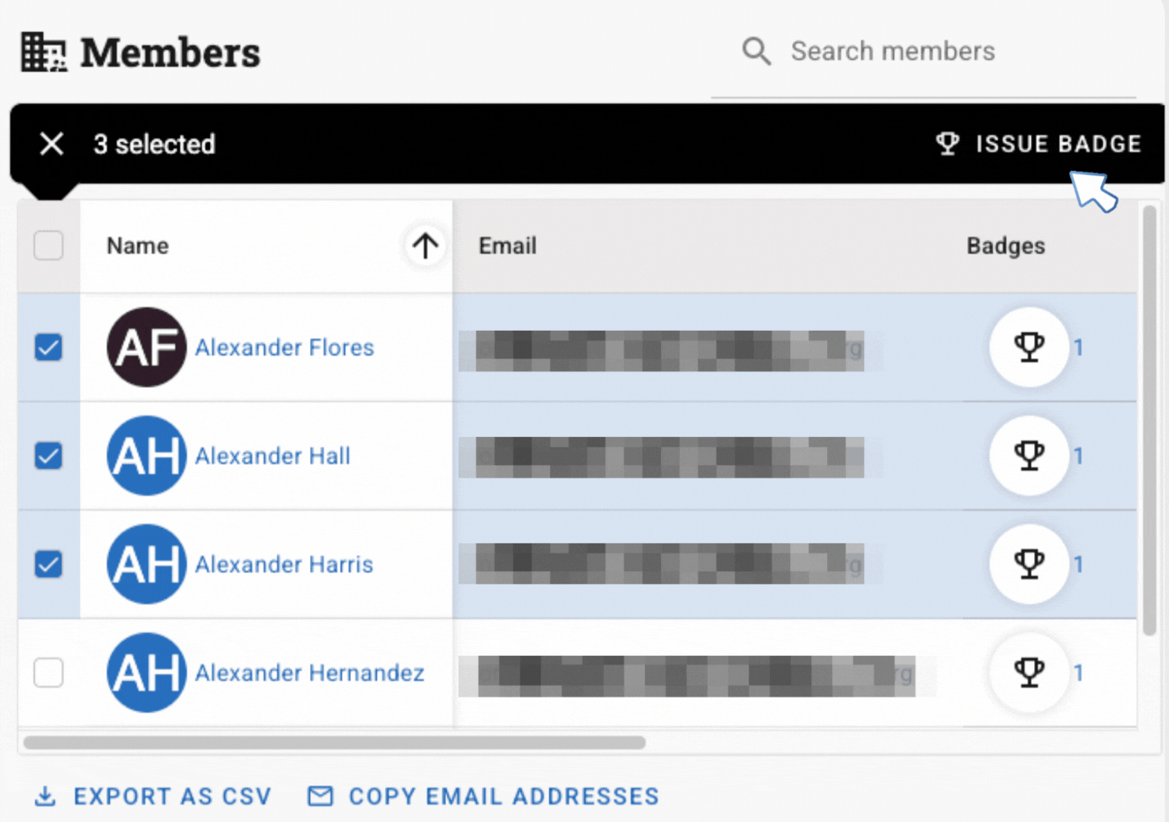 Alternatively, you can select multiple users and bulk issue a badge to them: