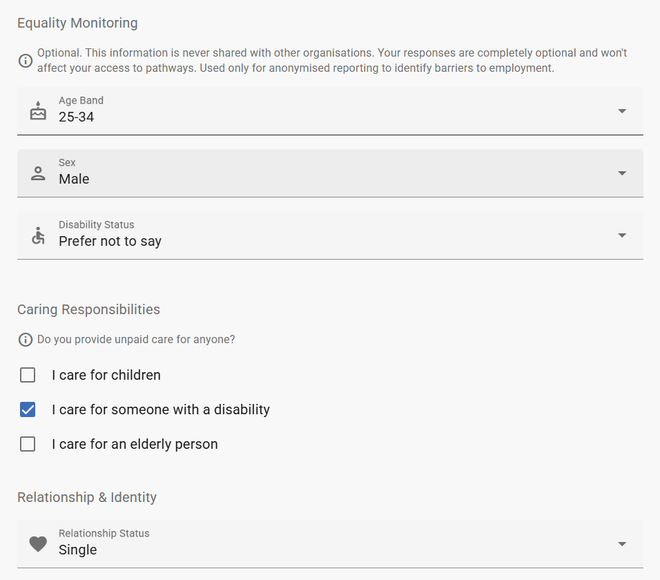 We are introducing a dedicated Equality Monitoring section in user settings. This new section helps you capture important demographic data with streamlined data collection. Fields only appear when relevant, making it easier for members to complete whilst keeping the process simple.
